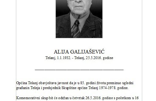 In memoriam: Alija Galijašević Press Opcine 26.05.2016. Općina 253 Pregledi Opširnije na opcina-tesanj.ba. 2016-05-26 Press Opcine Podijeli
