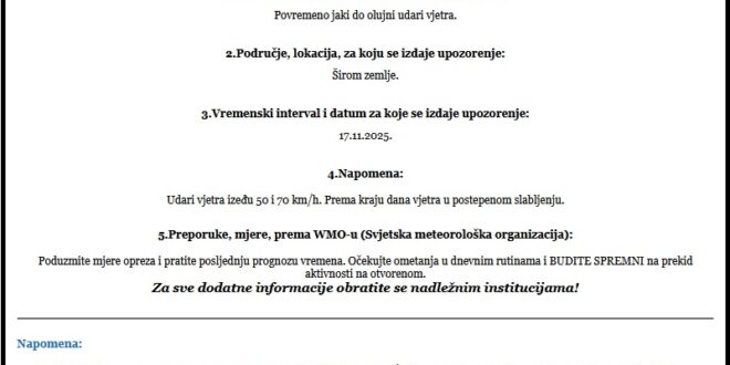 Federalni hidrometeorološki zavod izdao je „NARANDŽASTO UPOZORENJE“ za 17.11.2025. godine na povremeno jake do olujne udare vjetra širom BiH. Prognozirani udari vjetra su od 50 do 70 km/h, a prema kraju dana vjetar će biti u postepenom slabljenju.
