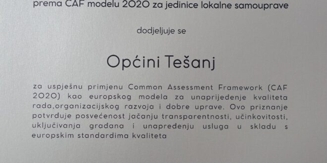 Federalno ministarstvo pravde i Agencija za državnu službu na svečanoj ceremoniji u Sarajevu dodjelili su priznanje Općini Tešanj za uspješnu provedbu procesa samoprocjene po CAF modelu koji predstavlja EU alat za razvoj ljudskih resursa u organima državne službe. CAF alat omogućava objektivno sagledavanje vlastitih kapaciteta, identifikuje područja za unapređenje te uspostavlja održive i transparentne standarde kvaliteta.