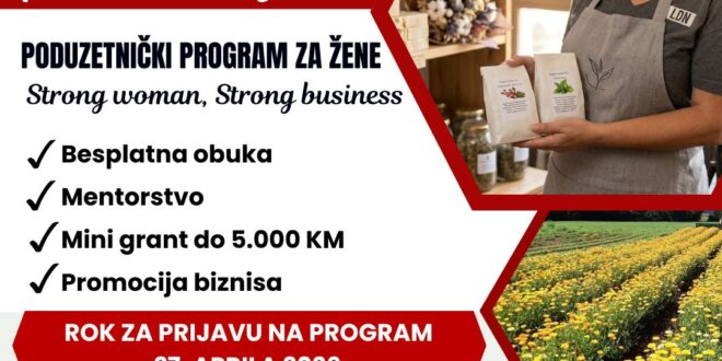 Općina Tešanj obavještava građanke da će se u ponedjeljak, 20. aprila 2026. godine od 12:00 sati u sali Općinskog vijeća Tešanj u saradnji s Udruženjem Žene za Žene International održati info sesija za program „Strong Woman, Strong Business – poduzetnički bootcamp”.  Projekat „Unapređenje poduzetništva žena iz ruralnih područja i lokalna ekonomska inkluzija“ implementira udruženje  Žene za Žene International u Bosni i Hercegovini, u partnerstvu sa organizacijom Empow’Her Global (Francuska), a sufinansiraju ga Vlada Švicarske i Francuska razvojna agencija (AFD).
