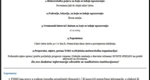 Federalni hidrometeorološki zavod izdao je „NARANDŽASTO UPOZORENJE“ za 17.11.2025. godine na povremeno jake do olujne udare vjetra širom BiH. Prognozirani udari vjetra su od 50 ...